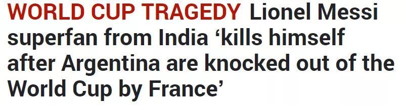 此举不仅是球迷们对爱豆们的尊重,更是赢得了世界各地网友们的盛赞! 如此冷静理智的日本粉丝们是全世界球迷们学习的榜样。然而最近在这届世界杯期间,有几位疯狂粉丝的行为实在让人费解。 20岁印度小哥上吊自杀 根据英国《太阳报》报道,本次世界杯的悲剧之一,是有一位来自印度的超级粉丝,在阿根廷3-4输给法国无缘世界杯8强之后抑制不住悲伤,竟在家中选择上吊自杀。