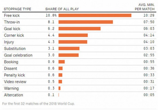 除此之外,FiveThirtyEight网站还统计出了32场比赛中各个环节的平均耗时:数据显示,几乎每场比赛有8分钟在等待球被扔进界内,有6分钟在等待门将开球。