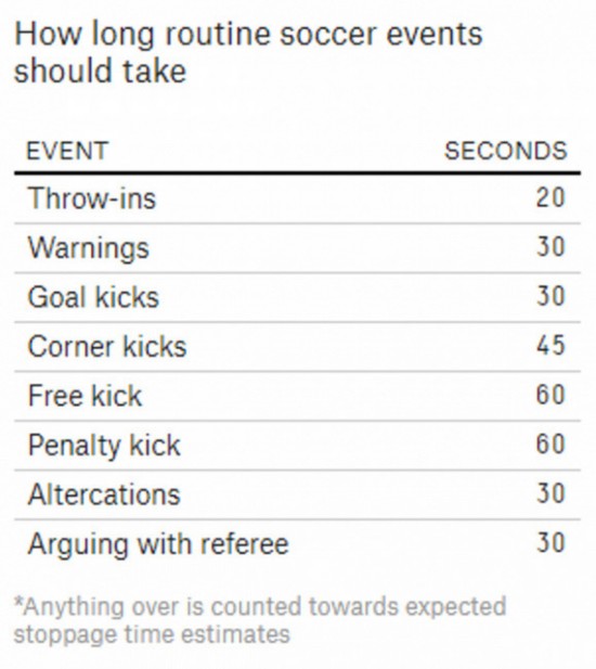 为了阐释这一点,该网站在进行了大量的研究与比对之后统计出了一场足球比赛中各项活动的平均耗时,并以此为基准计算球员们究竟浪费了多少时间。举例而言,在这一组基准数据中,一位门将开门球的时间约为30秒,也就是说,如果某位守门员花了41秒才将球从球门区踢出,那么他就有11秒的过度耗时,而这11秒应当被加入补时之中。