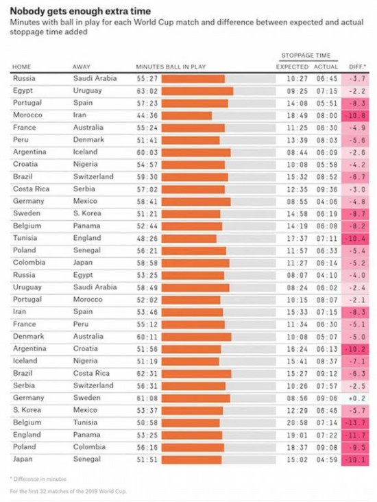 考虑到这一点,一家名为FiveThirtyEight的网站研究了俄罗斯世界杯小组赛阶段的前两轮比赛,试图检验裁判员对每场比赛伤停时间的把握。为此他们记录了32场比赛的所有暂停时刻:共3194次,或者说,每58秒一次。