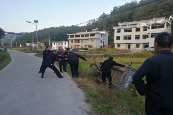 三轮车侧翻“三脚朝天”,江西兴国警民齐心协力成功施救