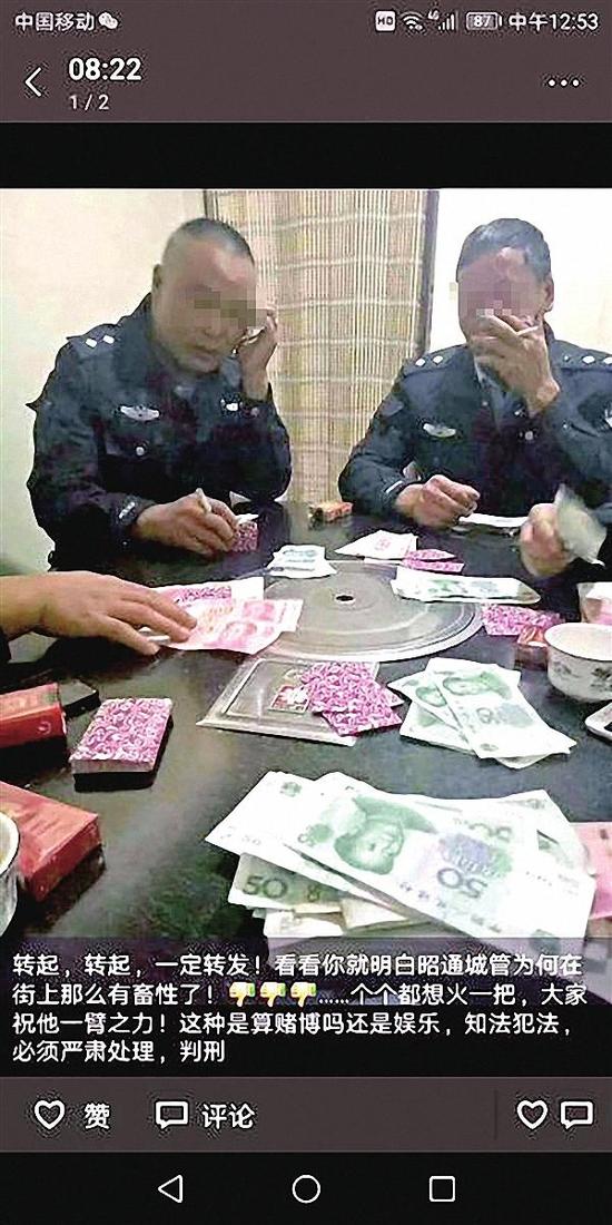 (原标题:穿制服聚赌被晒图 这4个城管“火”了 “@鲁甸警方”通报: 临时聘用人员 目前已被行政拘留) 城管人员穿制服赌博视频截图 来自春城晚报 据春城晚报报道 在全国打击赌博活动的当下,云南鲁甸县3名身着制服的城管队员聚餐时旁若无人地聚赌,赌得还不小,现场赌博的视频“流出”后被“搬上”网络,引起了社会各方关注和热议。本月22日,记者从鲁甸县公安局获悉,涉嫌参与赌博的4名城管人员已被依法行政拘留和罚款,再次给那些赌瘾比较大的人敲响了警钟。 穿城管制服赌博成“网红” 22日,关于几名城管穿着制服赌博的图片和视频,不断在昭通微信群和朋友圈里刷屏,网友一片哗然。 记者看到,相关视频和图片显示,有两名穿着城管制服的男子和其他人员聚赌,赌桌上堆满了面额为50元或100元的现金,整个“赌场”烟雾缭绕,喧闹嘈杂,参赌人员激战正酣。 随后,记者从鲁甸县公安局核实,当时参与赌博的共有4名男性城管队员,均属于鲁甸县茨院乡综合执法队的临时聘用人员。 4名涉赌城管均被拘留罚款 据鲁甸县公安局公号“@鲁甸警方”通报,15日中午12时许,鲁甸县公安局茨院派出所民警在工作中发现,在微信朋友圈内“晒”出了有人身穿制式服装参与疑似赌博的照片及视频,随即开展调查工作。 经调查,14日中午12时许,鲁甸县茨院乡执法大队成员潘某云、赵某岭、毛某青、赵某庚及社会人员赵某雍一起在一火锅店聚餐,吃完饭后,五人就开始以“翻金花”的方式进行赌博,每人每次下赌注50元、100元或200元后,每人发3张牌,然后统一翻开比大小,牌面大的赢。 在赌博过程中,赵某岭、潘某云、毛某青穿着执法大队的制服进行赌博,加之赌博现场又被上传到网络,社会影响恶劣,严重败坏了社会风气。茨院派出所经过查证后,根据《中华人民共和国治安管理处罚法》第七十条之规定,分别依法给予潘某云、赵某岭、毛某青、赵某庚和赵某雍行政拘留十一日至十三日不等、并处罚款的处罚。 目前,潘某云、赵某岭、毛某青、赵某庚和赵某雍已被依法送鲁甸县拘留所执行行政拘留。 |