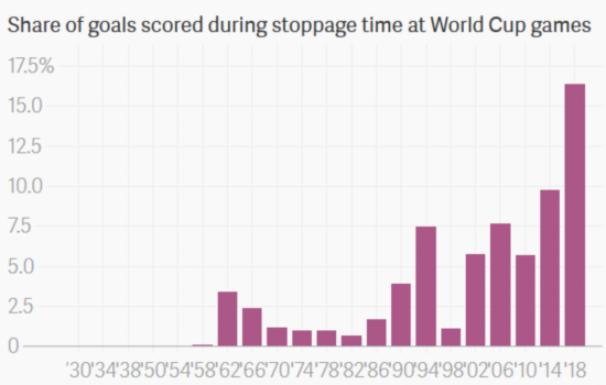 这是什么概念?自1958年世界杯引入补时概念以来,此前最高的比例就是上届世界杯,补时进球占比10%,但和今年相比也是小巫见大巫。